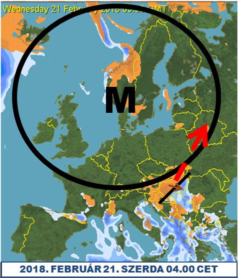 Ekkortól a „szokásos megosztó szcenárió szerint” a nyugati országrészben tartósnak ígérkező havazás, a keletiben esőzés kezdődik (2. ábra fekete választóvonala). A Dunántúl nyugati részén a jelenlegi előrejelzések szerint napközben is fagypont közelében marad a hőmérséklet, komolyabb hótakaró kialakulására számíthatunk. Jelenleg úgy tűnik, a havazás péntekig kitart, ekkor töri át a mediterrán ciklon az anticiklon védvonalát (mindkét ábra piros szaggatott nyila), hazánkban pedig a hóesés súlypontja a keleti országrészbe helyeződik át (2. ábra kis barna nyila).