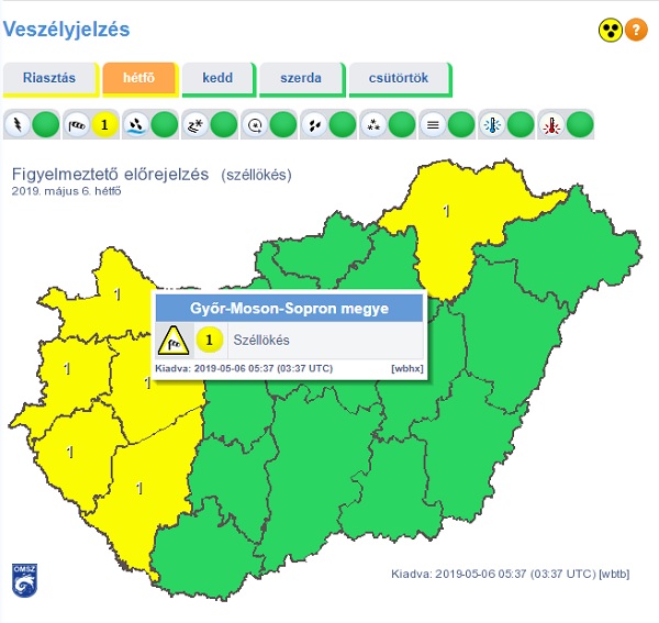Hétfőn a várt legerősebb széllökések meghaladhatják a 70 km/h-t.