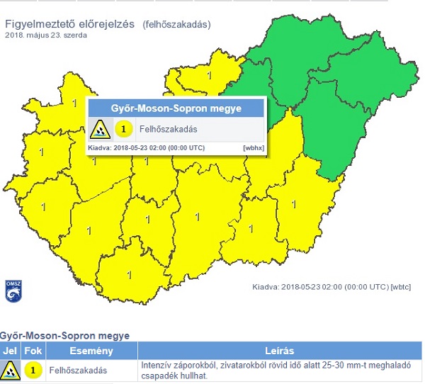 Ma szórványosan – délelőtt leginkább középen, a délutáni órákban pedig elsősorban az ország délnyugati felében – valószínűbb nagy számban zivatarok kialakulása, felhőszakadás (kis területen gt; 30 mm, a délnyugati országrészben gt; 40 mm), viharos (60-80 km/h) szél és egy-egy helyen jégeső (1-2 cm körüli átmérő) kíséretében. Szerdán is többfelé, elsősorban a Dunántúlon számíthatunk záporokra, zivatarokra, köztük heves zivatarok is, melyeket felhőszakadás, jégeső és viharos szél kísérhet.