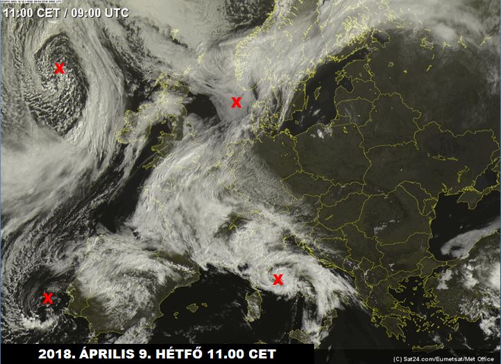A hétfő déli állapot szerint Nyugat-Európa partjainál „egymás fölött” két ciklon is található (középpontjuk piros X-szel jelölve), melyek egymásba fonódó áramlásrendszere egy, a komolyabb korcsolyázók bemelegítő figurájához hasonló, kicsit nyújtott nyolcast „karcol a(z) (j)égre”. Még két ciklonközéppont is felismerhető a képen, Kelet-Európa fölött viszont csend és nyugalom honol. Ez a nagyvonalakban stabil hét-elejei állapot egész szombatig marad.