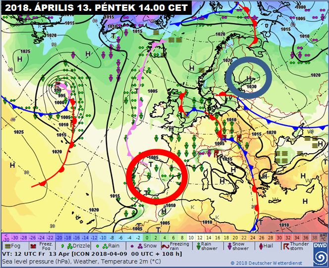 A 2. ábra péntekre vonatkozó előrejelzése épp egy ilyen „próbálkozás” utáni állapotot ábrázol, amikor a középpontjával Szentpétervár térségében állomásozó anticiklon engedékenysége következtében egy gyenge frontrendszer zivatarzónája haladt át a Kisalföld fölött. A „pengeváltásból” szokás szerint mindkét fél meggyengülve kerül ki, egy ciklon dél felől próbálja az erejét épp visszanyerni készülő anticiklont „kicselezni” melynek következtében a hét végére kiegyenlítődnek a nyomásviszonyok, újabb záporok, zivatarok kialakulását támogatva. Ekkor az átmeneti szünet után ismét feltámad a szél, de gyengébb marad, mint a hét elején volt.