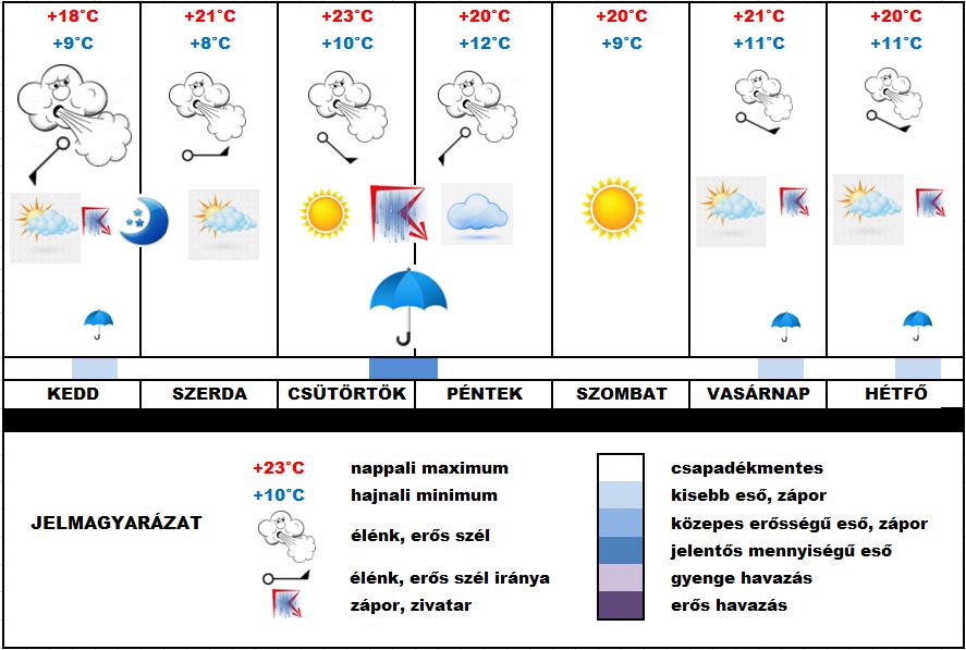 A csütörtök derült éggel indul, majd késő délután erősen megnövekszik a felhőzet, s az esti-késő esti, hajnali órákban szélerősödés kíséretében a Kisalföldön is várhatók heves záporok zivatarok. Ezek elvonulása után pénteken jobbára felhős marad az ég, gyengül a légmozgás. Szombaton várható a legkevesebb felhő, mérsékelt légmozgással, aztán vasárnap és hétfőn változóan, jobbára erősen felhős égbolt várható, a Kisalföldön a közepesnél kisebb eséllyel záporral zivatarral. A hőmérséklet egész héten vegyenletesen alakul, keddtől csütörtökig kissé emelkedik, a zivatarok távozása után kicsit visszaesik, de fázni nem fogunk, szombattól stabilan +20°C köré áll be.