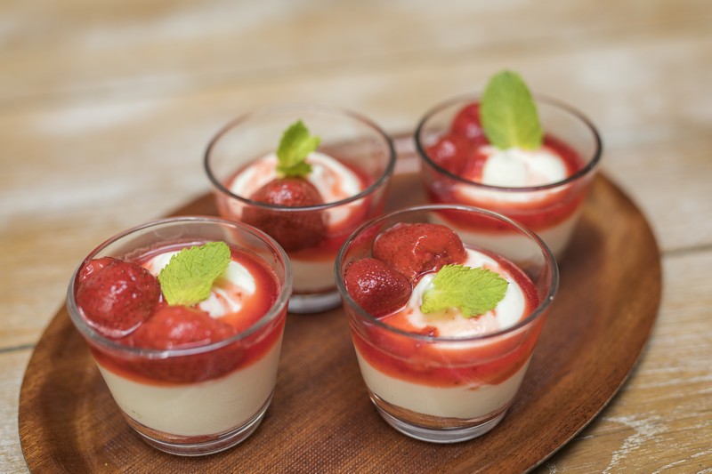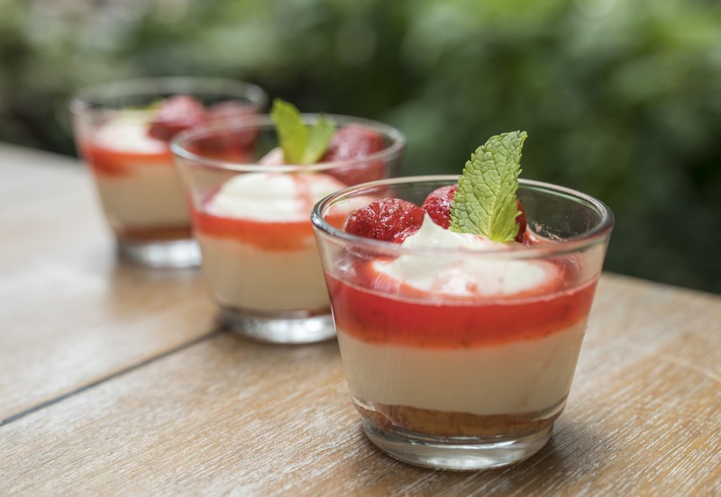 Az epret a cukorral addig főzöm, amíg lekvár állagú szószt nem kapok, és miután ez kihűlt, a piskótával és a krémmel pohárba rétegezem.