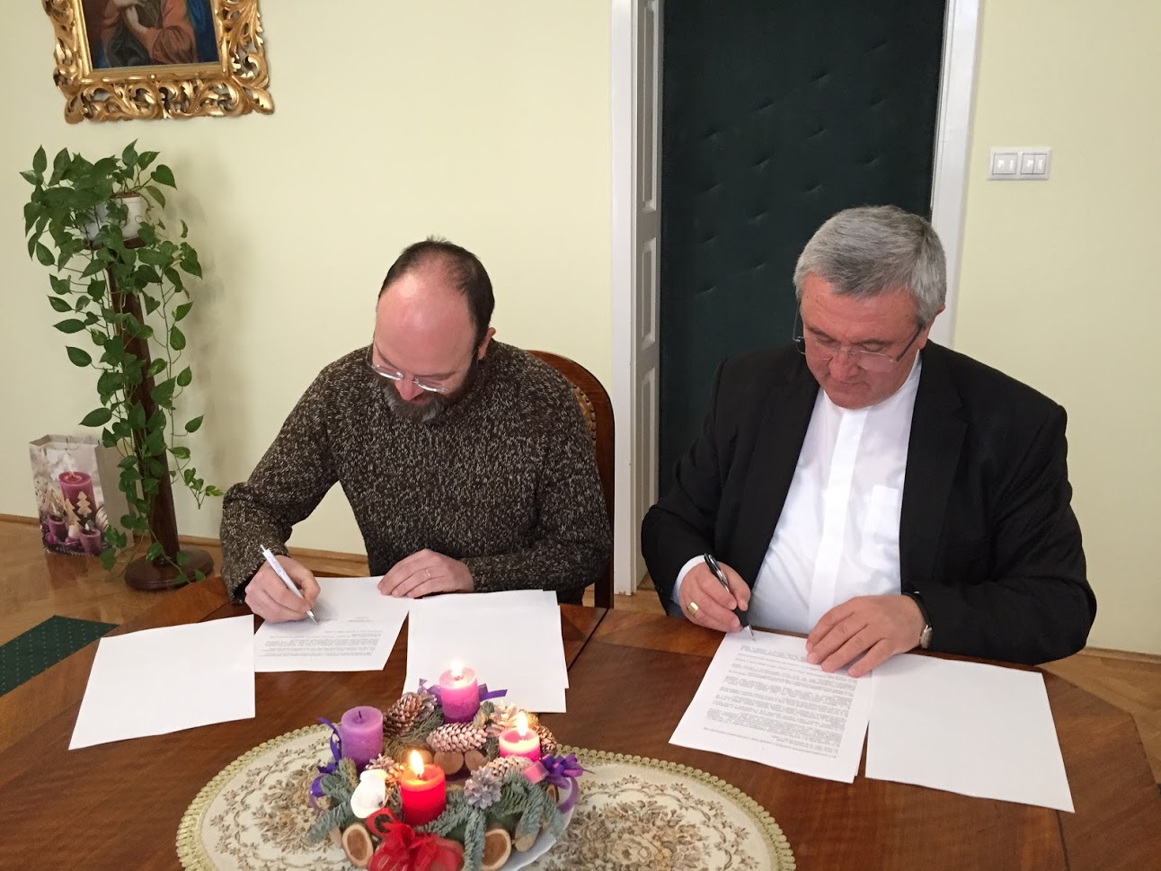 Veres András győri megyéspüspök és Gyarmati András, a Gyarmati és Társai Mérnöki és Szolgáltató Kft. ügyvezetője december 21-én aláírták a győri Nagyboldogasszony-székesegyház rekonstrukciójának második üteméről szóló szerződést a Püspökvárban.
