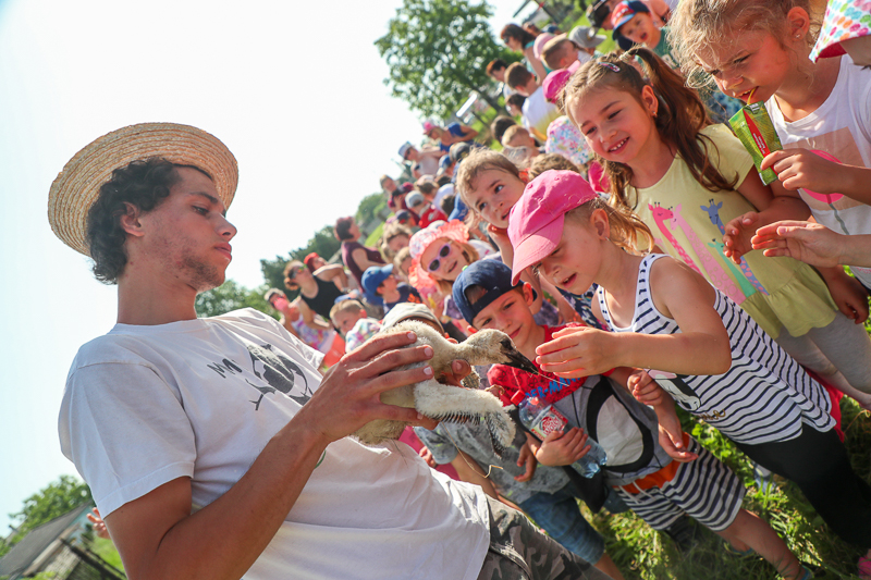 A kis gólyákat egy daru segítségével vették ki fészkükből, hogy a földön nyugodt körülmények között végezhessék el a jelölést. Az esemény egyben keresztelő is volt, mert a környékbeli iskolákból és óvodákból összegyűlt gyerekek a Bolyhi, az Iván, a Vatta és a Hópehely nevet választották a néhány hetes fiókáknak.