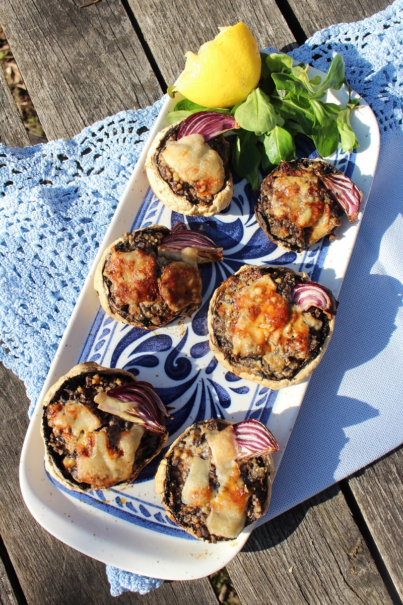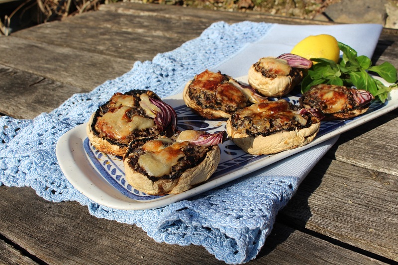 Sokan próbáltuk már a darált húst, a szalonnát, a sok sajtot, de most egy egészen más ötletem van a gombák megtöltéséhez. A színskálából és ízvilágból hasonló összetevőkkel találtam magam szemben egy asztalnál, amelyek ránézésre és kóstolásra is jól illeszkedtek. Egy nagy marék fekete olívabogyót összemixeltem egy pohár frissen pucolt dióval. Hogy markánsan kihozzam az ízeket, ráfacsartam fél citrom levét és 1 kanál mézzel adtam meg a lényegét. Azt kell mondanom, pirítósra sem utolsó, de most beletöltöttem a gombákba, leszórtam sajttal és egy kis lila hagymával díszítettem. Esti falatkáknak vagy gyors kis útravalóknak is gyakran készítem. Nem potyog, nem csurog és adagonként raktározható. Ennek ellenére én burgonyapürével szeretem a legjobban friss zöld salátával tálalva.