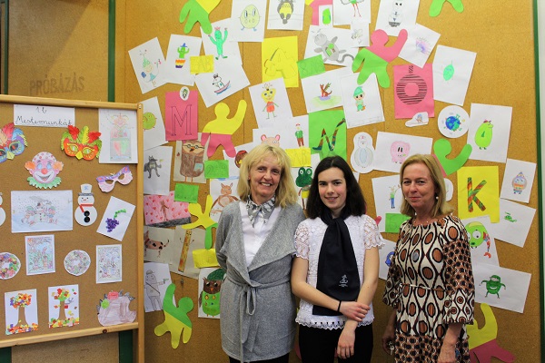 Kissné Zseli Blanka rajztanár, Koszonics Gréta elsődíjas kabalatervező és Dr. Ruppertné Hutás Kinga a kabalapályázatra érkezett rajzok előtt.