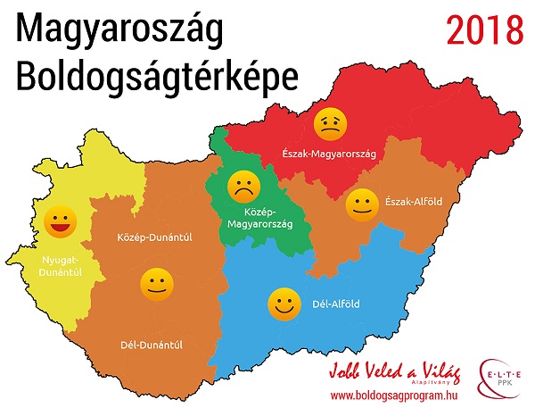 A térképről leolvasható, hogy mely régiókban és megyékben milyen mértékben tartják boldognak magukat az emberek.