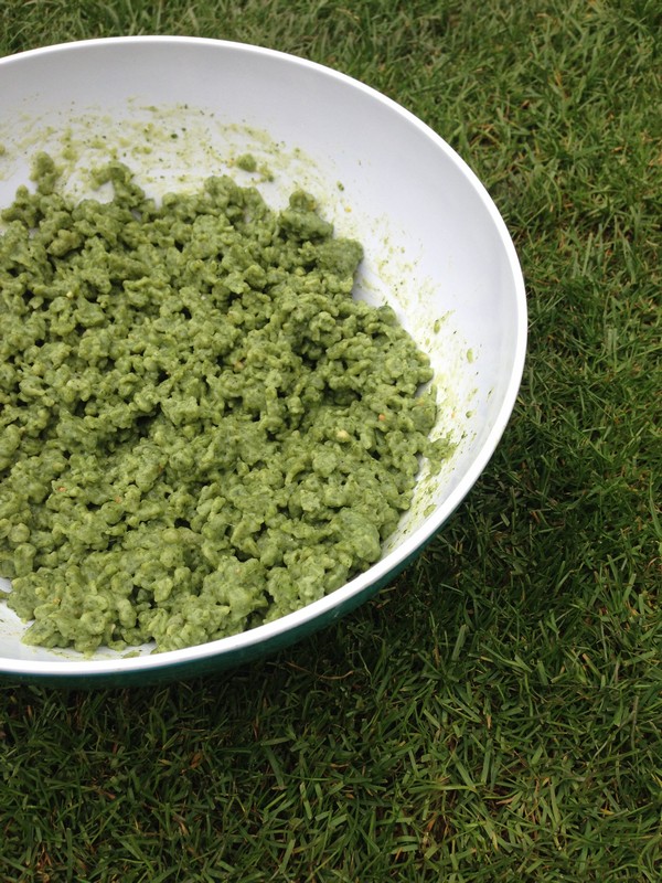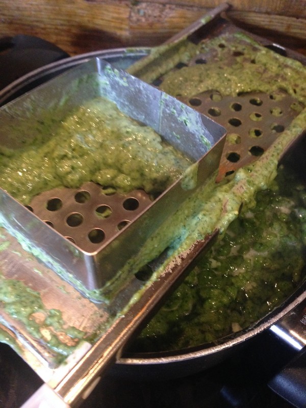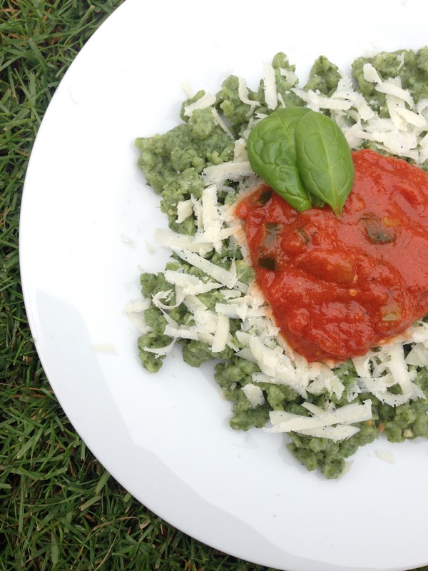 1- A galuskához egy nagy tálba a tojást összekeverjük a megfonnyasztott, kis vízzel összeturmixolt hideg spenóttal (hiány esetén fagyasztott püré is lehet).