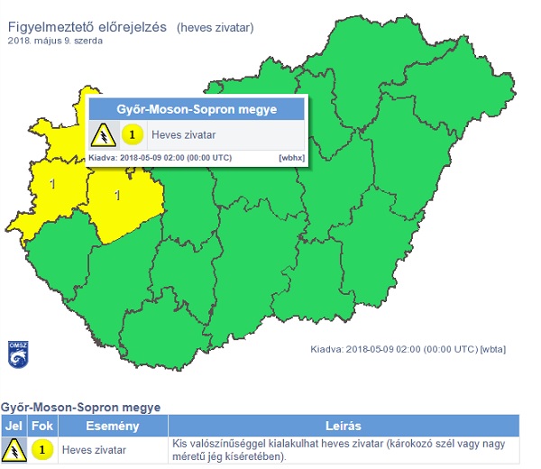 Szerdán az ország délnyugati részének kivitelével elszórtan, nagyobb eséllyel a Dunántúl északi felében valószínűek zivatarok viharos szél (60-80 km/h) és egy-egy helyen lokálisan jelentősebb mennyiségű csapadék (15-25 mm) kíséretében.