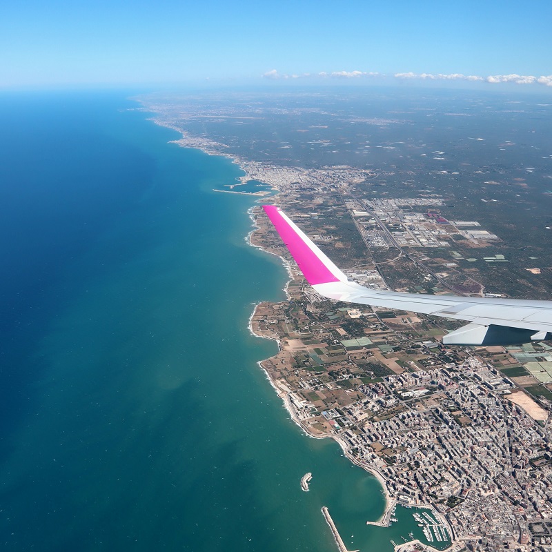 Érdemes a család legalább egy tagja számára ablak melletti ülőhelyet vennünk, felszálláskor ugyanis remek kilátás nyílik a fővárosra vagy a Fertő tóra (bécsi indulás esetén), útközben pedig megcsodálhatjuk a dél-dalmát szigetvilágot. Az igazi meglepetés azonban csak akkor következik, amikor a repülő beér az olasz partok fölé. Jó idő esetén teljes hosszúságában megmutatja magát az olasz csizma sarka: zöld erdeivel, rendezett olajfaültetvényeivel és hófehér kisvárosaival. A part mellett jól látszik az a széles, langyos vizű, türkizkék tengersáv, ami a strandolók körében annyira népszerűvé teszi ezt a vidéket.