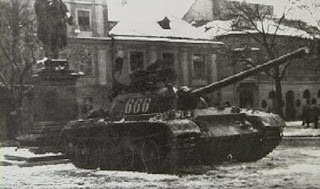 Később megtanultam: T-54-es szovjet tank volt, ami valósággal beszorult a köz bejáratába. Mélyen belekarcolva Erzsi néni lakásának a falába. Ám a különös történet ezután következett. Édesapám jól beszélt szerb-horvátul, hosszú ideig élt és alkotott, meg tanított az újvidéki (ma Novi Sad) művésztelepen, Baranyi Ferenc szobrászművész műtermében. Meg a gyönyörűen zöld Neretva partján, Mostarban, az ottani művésztelepen. Szóval az én édesapám megszólalt ezen a nyelven, s fenn, a lőállásból páncélsisakban derékig kimagasló, mongolarcú, vágott szemű szovjet katonát megkérdezte, nekem tolmácsolva mondanivalóját: Mit kerestek itt? S miért jöttetek ide, éppen ebbe a közbe?
