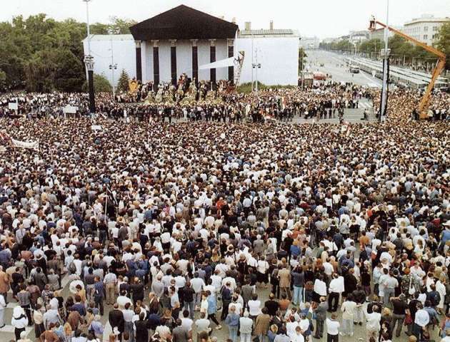 1989. NOVEMBER 4. – GYŐRTŐL A HŐSÖK TEREI KÖZIMÁIG. És amikor Romhányi és mások a nemzeti megújulásért, az oroszok kivonulásának sürgetéséért és 1956 hőseinek élő emlékezetben tartásáért a Hősök terére szólították a tömegeket, ott is részt vettem a nyilvános alkalmon Vékey Tamás barátommal. Fenn a hatalmas tribünön, reflektorok fényében, mikrofonok előtt. Ott hangzott el rövid történelmi hálaadó imám, amit a győri eseményekre emlékezve fogalmaztam meg, belefogalmazva a városomban átélteket.