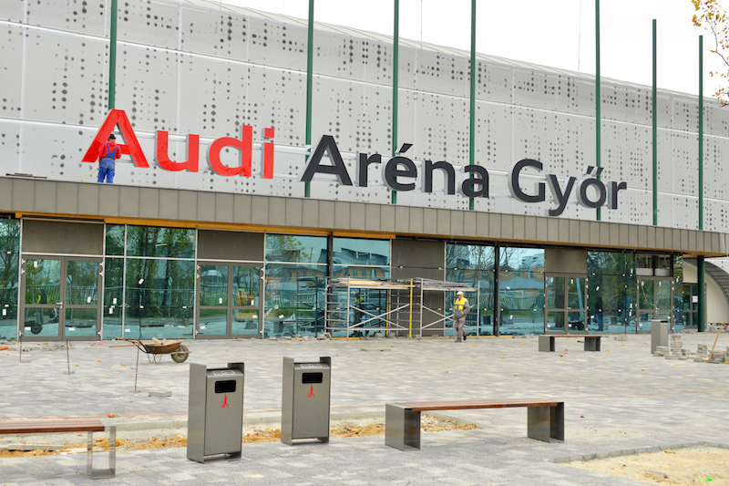 Június végén jelentették be, hogy tíz évre az Audi Hungaria Motor Kft. lett az aréna névadó szponzora; Borkai Zsolt polgármester akkor kiemelte: a januárban kezdődött, a kormányzat által ötmilliárd forinttal támogatott munkák eredményeként olyan sportcsarnok épül, amely decemberben már a női kézilabda Európa-bajnokság otthona, “ötcsillagos helyszíne” lesz.