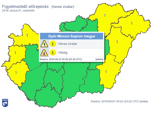 Csütörtökön túlnyomóan napos, meleg időre készülhetünk, elszórt záporok, zivatarok délután leginkább az Alföldön alakulhatnak ki. Estétől egy érkező hidegfront hatására északnyugat felől egyre több helyen számíthatunk záporokra, zivatarokra. Heves zivatarok is előfordulhatnak.
