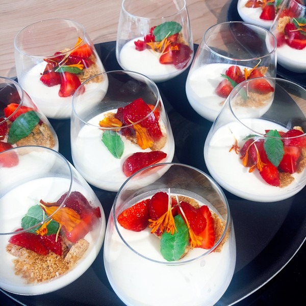 Az epreket lecsepegtetve a dermedt panna cottára tesszük.