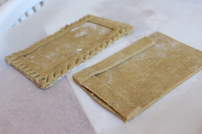 3- A tésztát elővesszük, kicsit átgyúrjuk és kinyújtjuk fél centiméteres vastagságúra. Lapokat vágunk belőle és peremet ragasztunk rá.