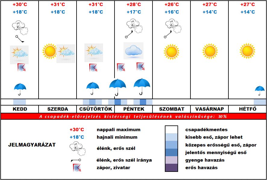 Pénteken hidegfront fog érinteni bennünket, ekkor a szél északkeletire fordul, növekszik a záporok, zivatarok kialakulásának valószínűsége, de az sem kizárt, hogy „száraz” lesz. Mindenesetre a mögötte érkező levegő biztos, hogy szárazabb és pár fokkal hűvösebb lesz. A hétvégén újból naposra fordul az idő és az északi áramlásiránynak, valamint az erősebb hajnali lehűlésnek köszönhetően a „forrón” búcsúzó tavasz után kellemes, kora-nyári időben lesz részünk. A szél egész héten mérsékelt marad, időnként élénkül csak meg, a hét elején DK-i, második felében ÉK-i irányból.