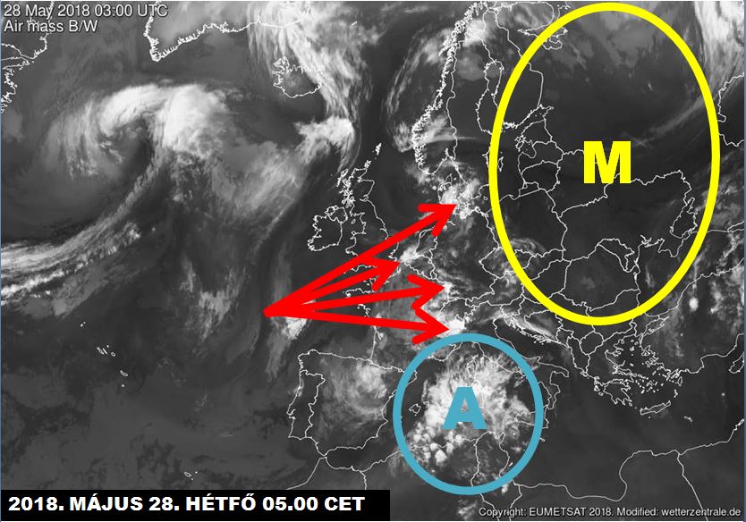 A két zóna közti átmeneti területen a helyi hatások „játékának engedelmeskedve” záporokat, zivatarokat magukba ágyazó felhőtömbök alakulnak ki, melyek a hétfő hajnali infravörös tartományban készült műholdfelvételen is jól láthatók (2. ábra piros nyilai). A hét első felében, péntekig hazánk is ebben a labilisabb zónában fog elhelyezkedni.
