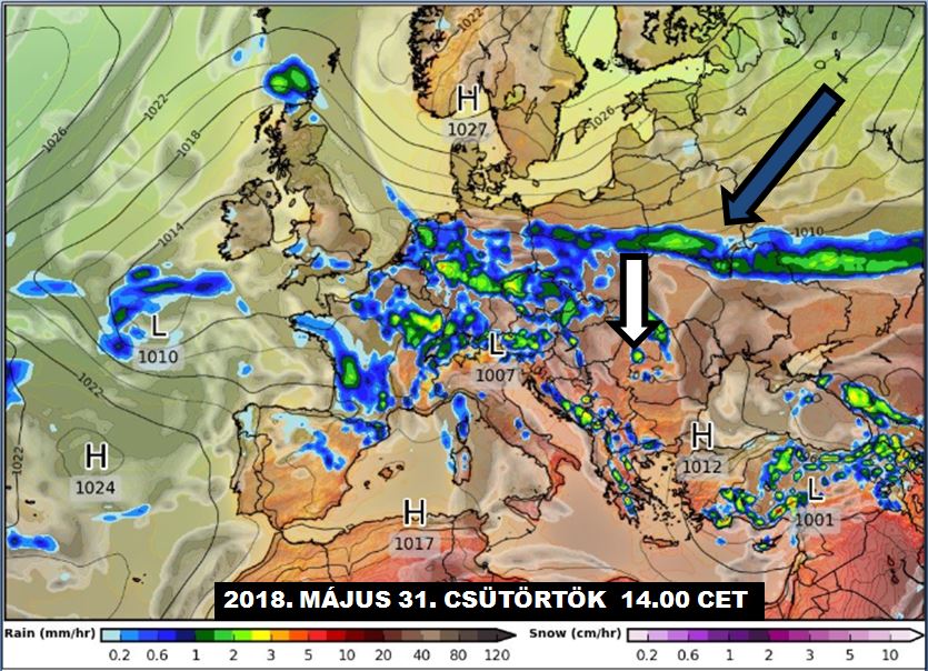 Ekkor azonban az anticiklon keleti oldalán lejjebb húzódó ciklon hidegfrontja fog áthaladni felettünk (3-4. ábrák fehér nyila), mely mögött északkelet – a Kelet-európai síkság – felől szárazabb és pár fokkal hűvösebb levegő érkezik fölénk (3-4. ábrák sötétkék nyila), napos, kellemes „pre-nyárra” transzformálva a „poszt-tavaszi” fülledt forróságot.