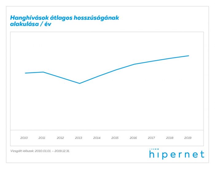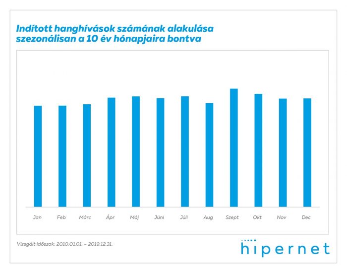A hanghívásokat vizsgálva látszik, hogy szezonálisan a legtöbb hívást szeptemberben indítják a mobilszolgáltató ügyfelei. A nyaralásról visszatérés, az iskolaszezon kezdete mind közrejátszhat a szeptemberben növekvő adatokhoz. Ez a hónap nem csak az indított hívások darabszámának nyertese a 10 év adatait tartalmazó elemzésben: az indított hanghívások átlagos hossza is ebben a hónapban a legnagyobb az év során.