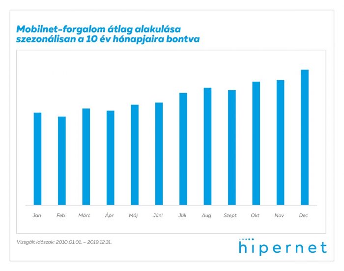 A hálózati forgalmat havi bontásban is vizsgálták, hogy megismerjék, az elmúlt évtizedben mely hónapok számítottak a mobilnetezés, a hanghívások és az SMS-ezés főszezonját a 10 év átlagában.