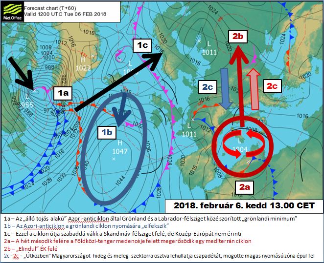 Az első felére, az 1. ábrán kedd délre előrejelzett helyzet lesz jellemző. Az Azori-anticiklon „álló tojás alakot” vesz fel, Grönland és a Labrador-félsziget közé szorítva a „grönlandi minimumot”, s blokkolva ezzel az Európa felé igyekvő nyugati áramlást. Így a kontinens nagy részén az Oroszország felé távozott frontrendszer mögött magas nyomású zóna épülhet fel, kissé hűvösebb, de nyugodt, csendes, csapadékmentes időt biztosítva hazánkban is.