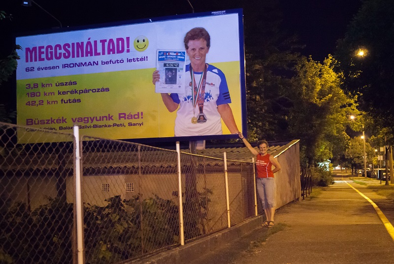 Óriásplakáttal lepték meg gyermekei Fügi Andreát, aki 62 évesen megcsinálta élete eddigi legnagyobb sportteljesítményét július végén Nagyatádon: Ironman befutó lett.