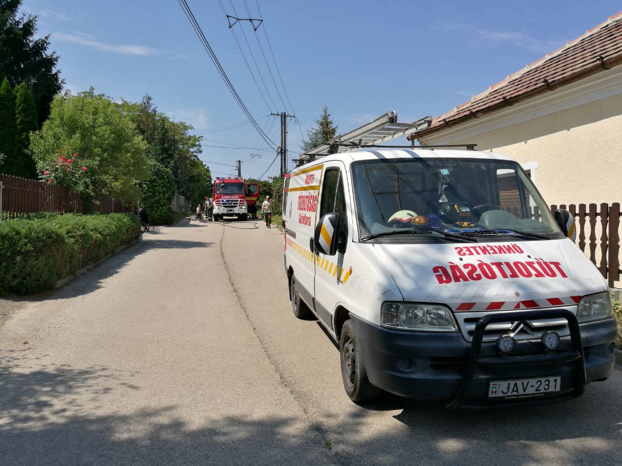 „Egyesületünk 07. 28-án 13:15 perckor kapott riasztást, hogy a győrújbaráti Erzsébet utcában növényzet kapott lángra. Egyesületünk 6 fővel kezdte meg a vonulást. Kiérezésünkkor több méteres lángokkal égett egy tujasor. Mivel a felső-vezeték is érintett volt. így porral oltó készülékek segítségével kezdtük el a beavatkozást a hivatásos állomány kiérkezéséig.