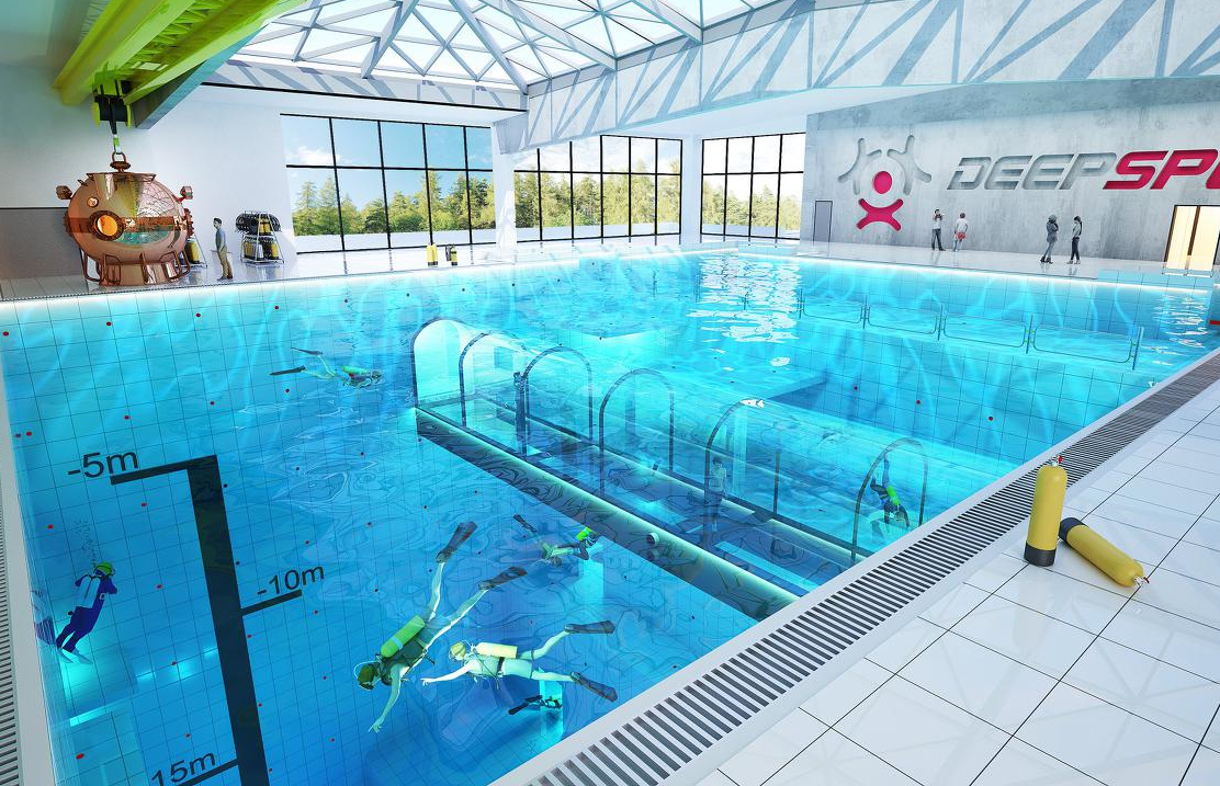 Idén ősszel nyílik meg a világ legmélyebb úszó- és búvármedencéje a közép-lengyelországi Mszczonówban: a 45 méter mély medence megtöltéséhez több mint 8 ezer köbméter vízre van szükség.