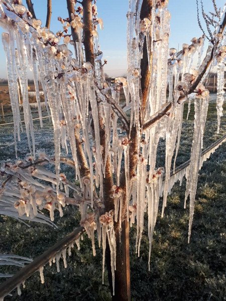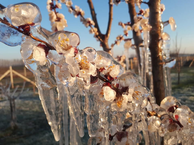 Jégbe zárt barackvirágok érdekes látványa tárul elénk az Időkép felvételein. A barackfákat a jégburok védi a hajnali fagytól.