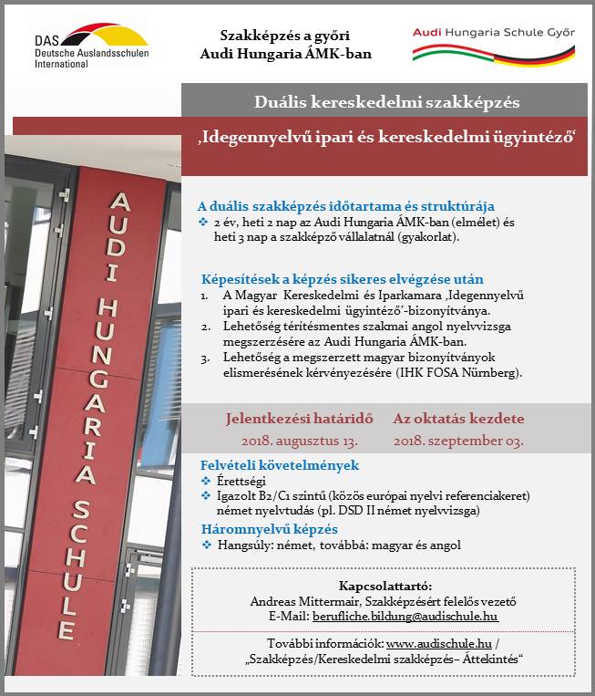 Az új szakképzéssel, valamint a pályázati folyamattal kapcsolatos további információ az Audi Hungaria Általános Művelődési Központ honlapján (www.audischule.hu) a „Szakképzés/Kereskedelmi szakképzés – Áttekintés“ címszó alatt található.
