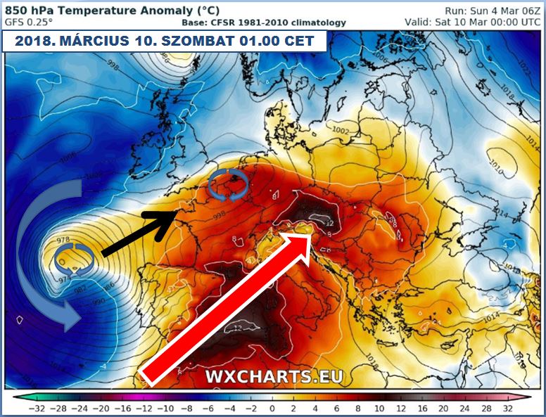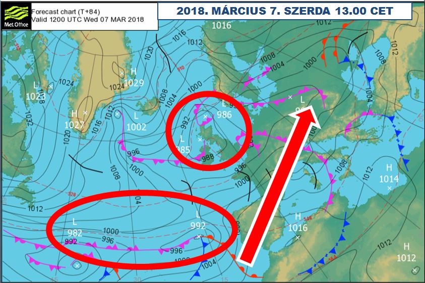 Nyugat-Szibéria és az atlanti-térség felett is az alacsony légnyomás lesz az úr. Kicsit „kinagyítva”, ugyanez a helyzet lesz a Kárpát-medence ekkor a Brit-szigetek feletti ciklon DNy-i szektorában, ún. „előoldali” helyzetben lesz.