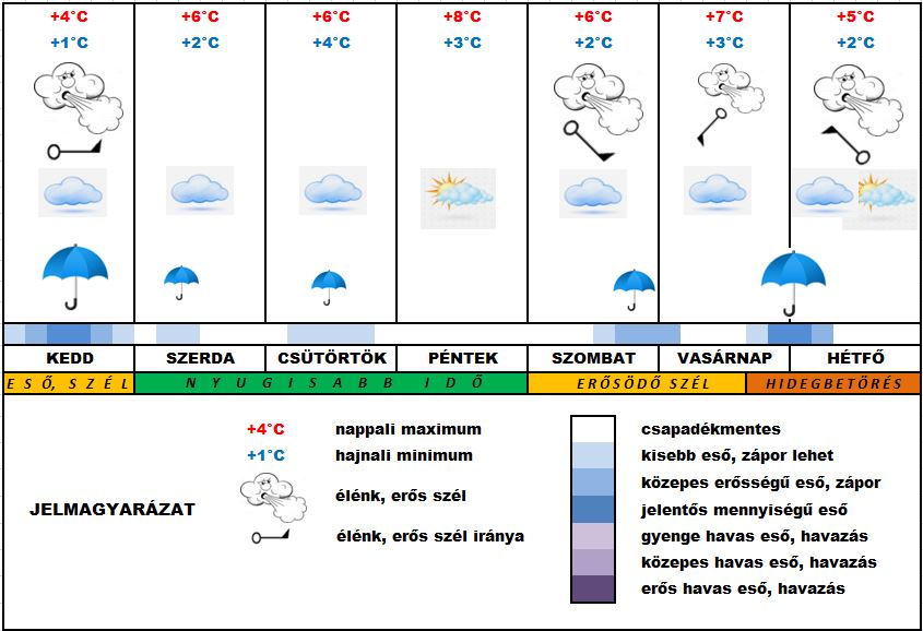 Kedden az utóbbi időben szokatlan jelenségben lehet részünk, a déli órák körül elképzelhető, hogy zuhogni fog az eső, mégpedig erős keleti szél kíséretében. Szerdára az idő megnyugszik, de szerdán és csütörtökön is számítani lehet kisebb esőre. A nappali felmelegedés erősödik, péntekre a felhők közül időnként előbukkanó Nap +10°C fokot megközelítő nappali maximummal kecsegtet.