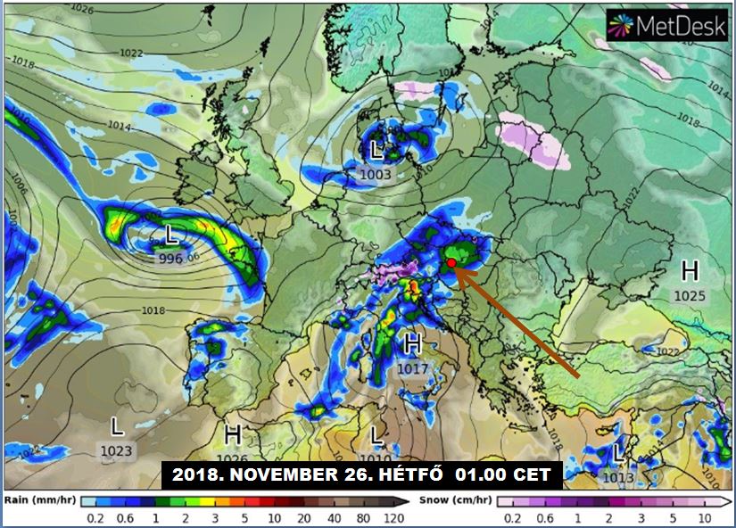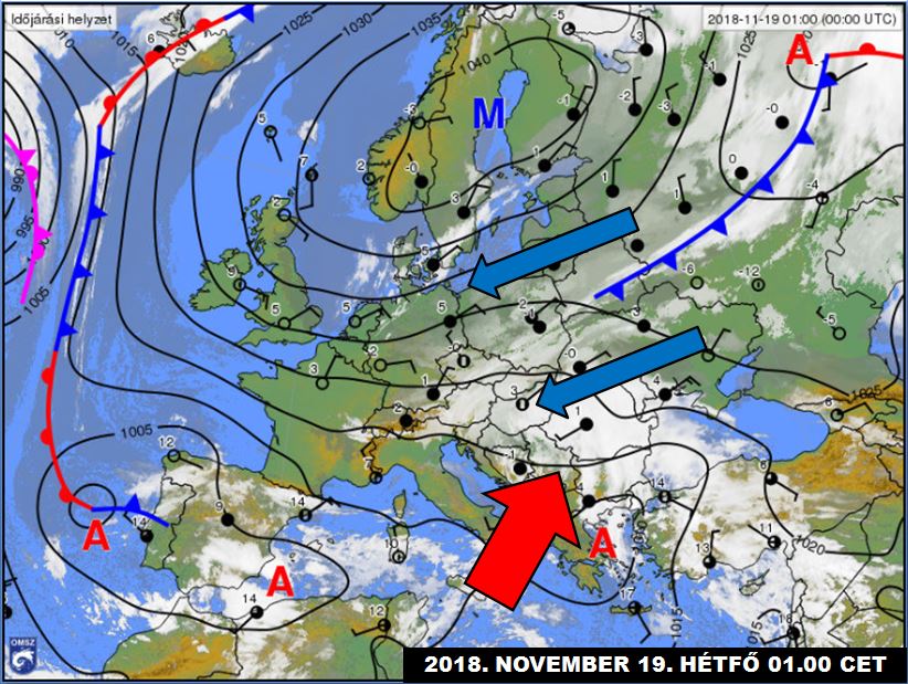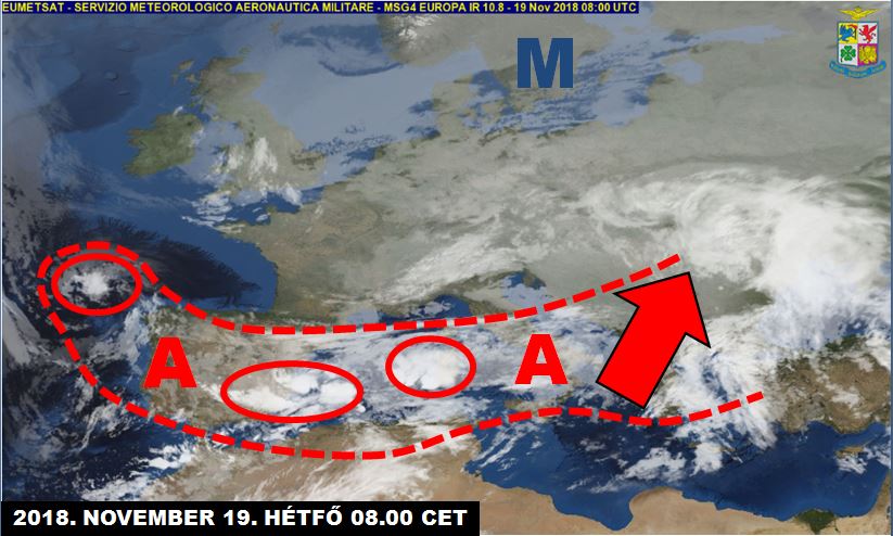 Ezúttal a Földközi-tenger oroszlánjának bajsza lett megrángatva, s egy, a medence teljes területét átfogó alacsony nyomású zóna kialakításával támadásba lendített egy mediterrán ciklont, visszaszorítva a túl messze merészkedett orosz macit (2. ábra műholdfelvétele, s a 3. ábrán az OMSZ hétfő éjjeli helyzetképe).