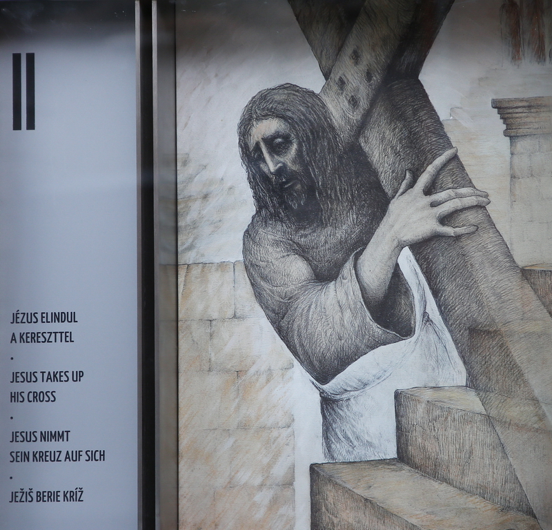 Csütörökön a második és harmadik stációt mutatták be. A második stáció a Káptalandomb 15. számú ház falán található, Kurcsis László grafikusművész alkotása: Jézus elindul a kereszttel. Finom vonalvezetés, diszkrét színezés jellemzi Kurcsics László grafikáit. „Már a második stációképen megjelenik a lépcső, amely az ötödik stáció képének szinte vezérszimbólumává válik. A mennyet a földdel, sőt az innen lefelé vezető régióval összekötő lépcsők a választás szabadságára utalnak, az arany háttér és Jézus stilizált arca az elmúlt korok szemléletét idézi. Rendkívül finom és kifejező a II. stáció Jézusának keze, míg az V. stáció Simonjának árnyékban tartott, plasztikusan modellált alakját önmagunkkal azonosíthatjuk.”