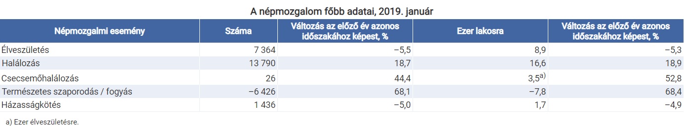 – Ezer lakosra 8,9 élveszületés és 16,6 halálozás jutott. Az előbbi 0,5 ezrelékponttal alacsonyabb, az utóbbi 2,6 ezrelékponttal magasabb volt, mint 2018 azonos hónapjában. Ennek eredményeként a természetes fogyás a 2018. januári 4,6 ezrelékkel szemben 2019. januárban 7,8 ezrelékre emelkedett. 2019 első hónapjában ezer élveszületésre 3,5 csecsemőhalálozás jutott, ami 1,2 ezrelékponttal meghaladta az előző év azonos havi értékét. A házasságkötési arányszám 1,7 ezrelék volt, 0,1 ezrelékponttal kevesebb, mint 2018. januárban.