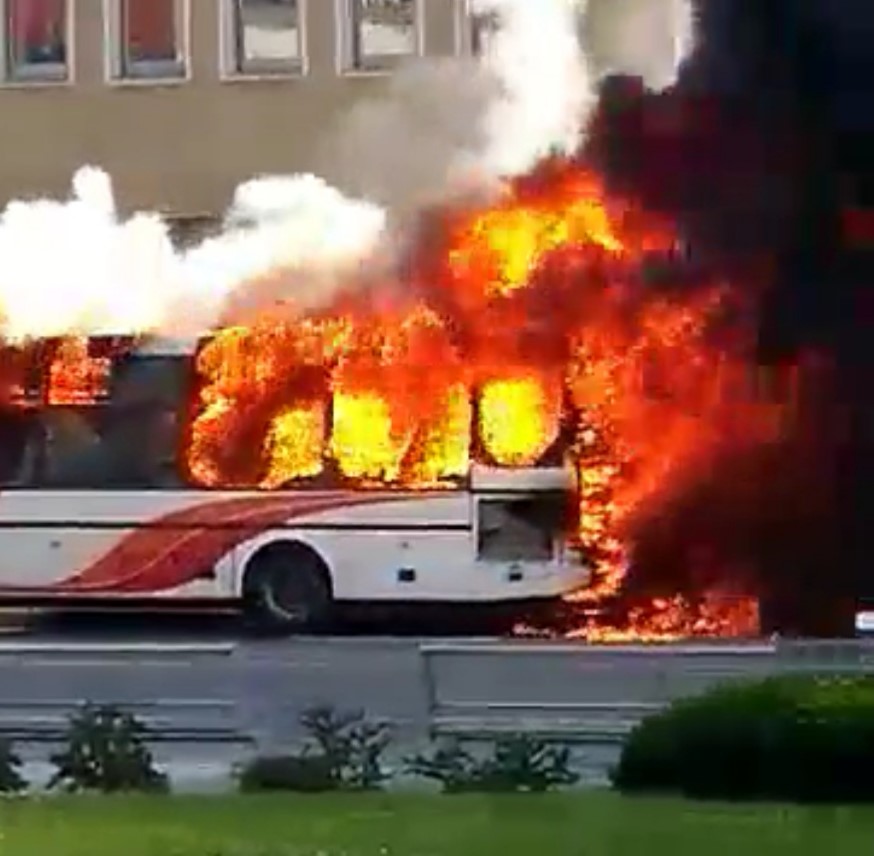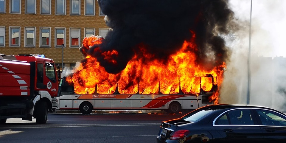 Teljes terjedelmében égett egy busz Győrben, a Budai úton. A város hivatásos tűzoltói két vízsugárral eloltották.
