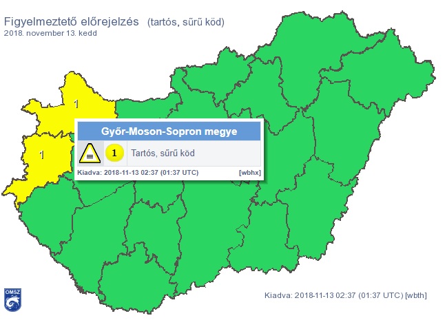 A tartós (gt; 6 óra) sűrű köd (látástávolság pár száz méter) miatt keddre is figyelmeztetés érvényes megyénkre vonatkozóan.