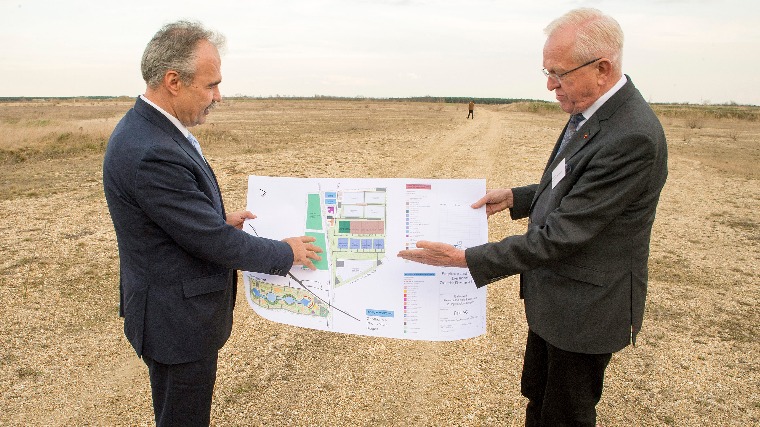 Nagy István agrárminiszter és Hubert Schulte-Kemper, a FAKT AG elnök-vezérigazgatója a cég tervezett beruházásának leendő helyszínén Hegyeshalom és Bezenye határában (Fotó: MTI/Krizsán Csaba)