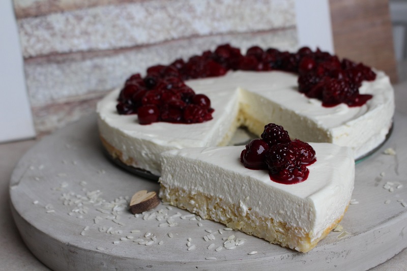 Szép, letisztult fehér desszert, a tetején élénkpiros gyümölccsel. Az egyik legvagányabb kombináció, mindez cukor nélkül. Ilyen az az édesség, amit én minden esetben szívesen ennék!