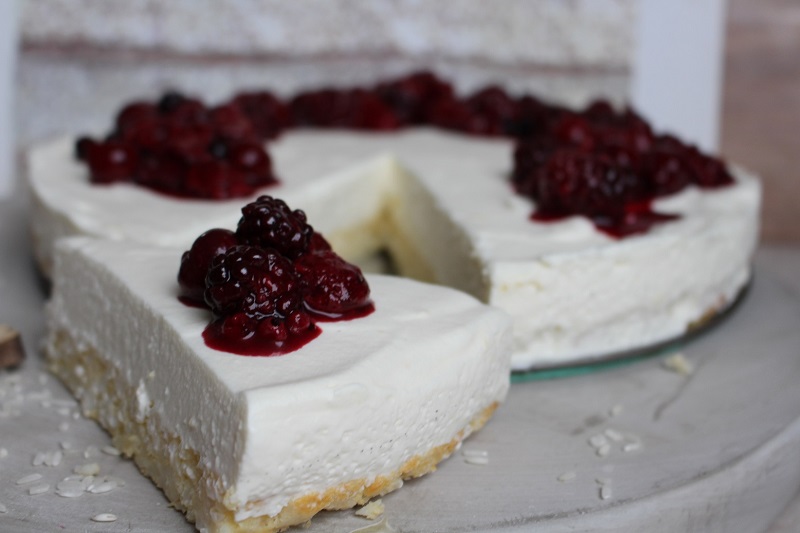 Szép, letisztult fehér desszert, a tetején élénkpiros gyümölccsel. Az egyik legvagányabb kombináció, mindez cukor nélkül. Ilyen az az édesség, amit én minden esetben szívesen ennék!