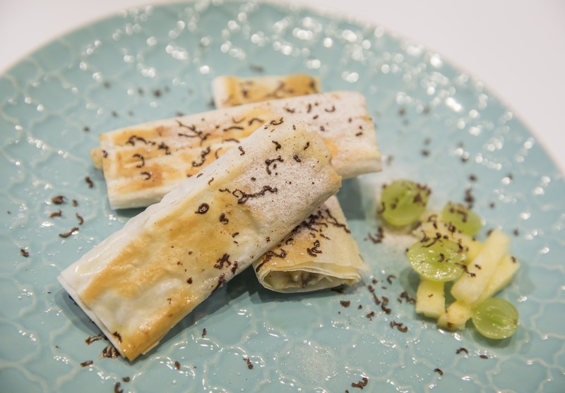 A réteslapot vágjuk körülbelül 10 cm széles csíkokra. A gyümölcsöket a csokival együtt aprítsuk fel, és tegyük körülbelül egy evőkanálnyi halmokban a lapok szélére. A réteslapokat feltekerjük és enyhén vajazott-olajozott serpenyőben megpirítjuk.