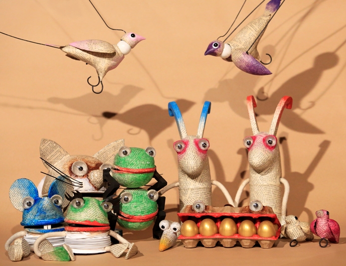 A diákok előadása klasszikus slágerekre készült, úgynevezett etűddramaturgiával, nincs egy kerek egész története, hanem egymás után hangzik el a nyolc mese, melyek villámtréfa-szerű történetek, La Fontaine-re jellemzően mindegyik egy-egy negatív emberi tulajdonságot karikíroz ki. A Boráros Szilárd által tervezett bábok papírból készültek, így olyanok, mintha a meséből léptek volna elő.