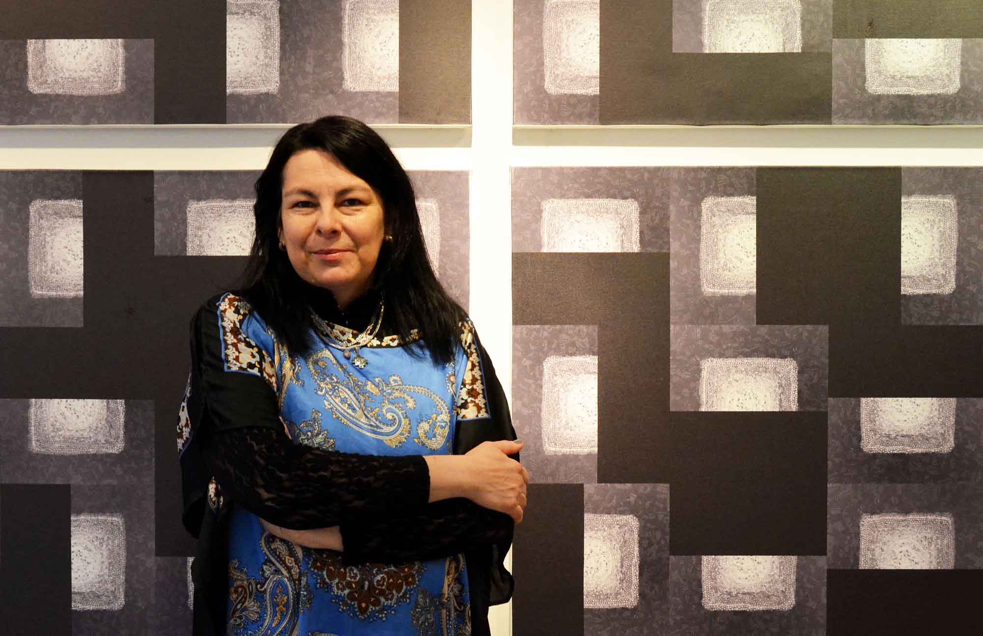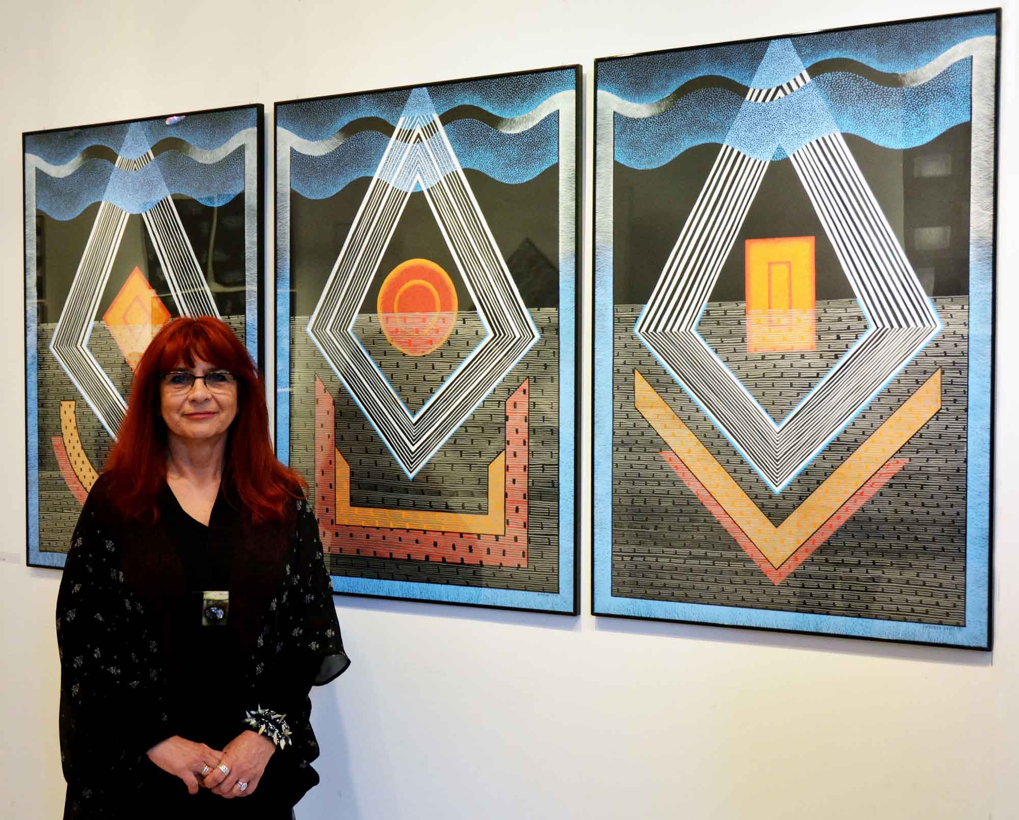 A másik kiállító Joanna Warchol, a kortárs lengyel képzőművészet egyik igen sokoldalú vezető egyénisége. Krakkóban született, a Krakkói Jan Matejko Képzőművészeti Akadémia festő szakán diplomázott 1985-ben. 2002 óta tagja, 2014 óta elnöke a Lengyel Képzőművészek Társaságnak. Művészi tevékenysége mellet kurátorként, művészeti íróként, kiadványszerkesztőként dolgozik. Festő, grafikus, designer. Mintegy 150 csoportos és több tucat egyéni kiállítása volt. Kiállításunkon bemutatott grafikái – látszólagos precíz geometriájuk ellenére is – a lírai geometria kategóriába sorolhatók. Az általában semleges színű mértani formák szigorúságát izzó vörösek, hideg kékek módosítják, míg az egyenes vonalak dominanciáját a sorozatokat összekapcsoló, organikus formákat idéző hullámvonalak írják felül. Művei akriltollal, akrilfestékkel készült papíralapú munkák, melyek egy karakteres művészegyéniség letisztult alkotói világába engednek bepillantást.