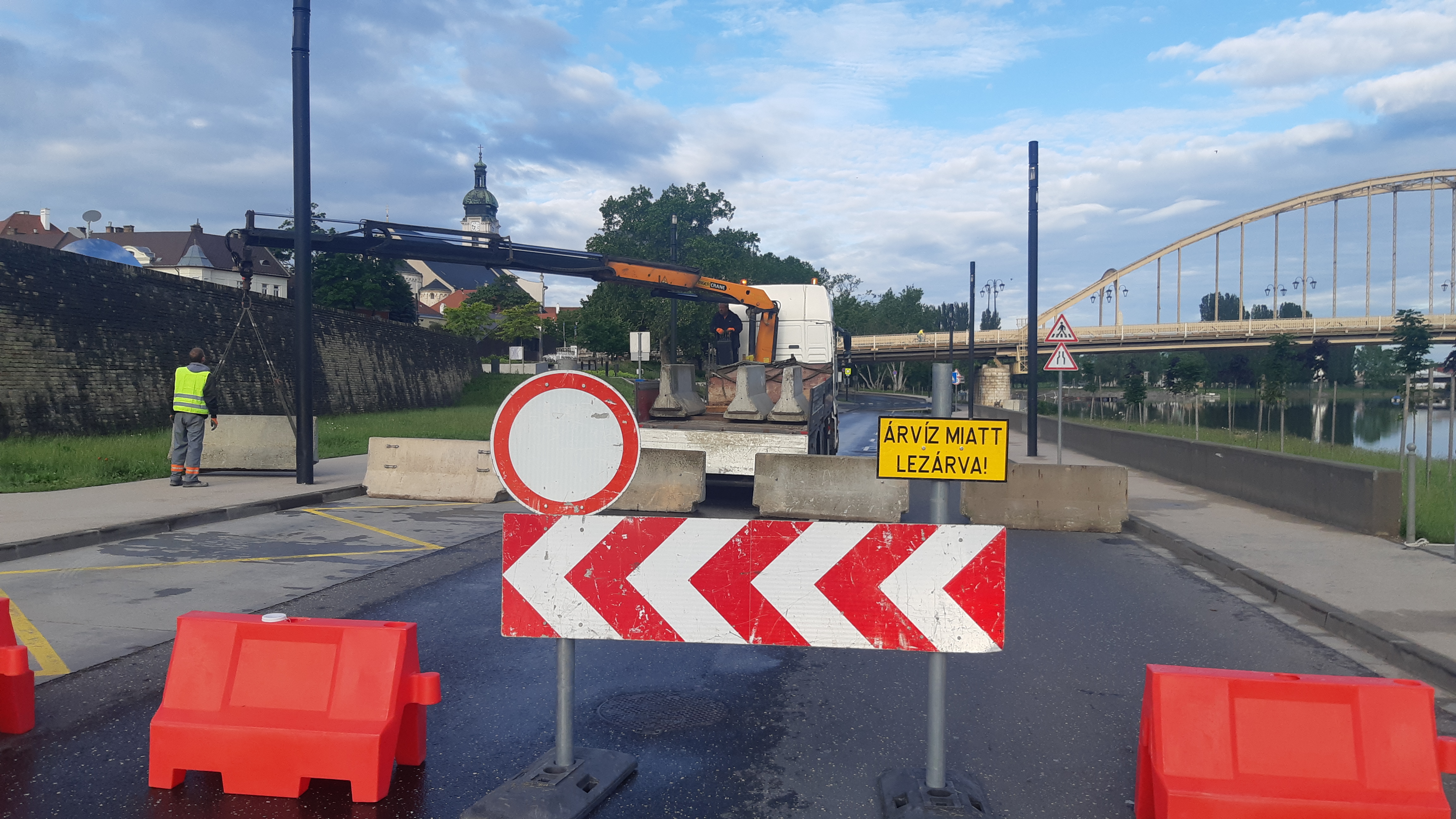 A Mosoni-Duna vízszintje ma hajnalra elérte a belvárosban a Móricz Zsigmond alsó rakparti út Kossuth-híd alatti szakaszát, ezért péntek reggel 6.30-kor lezárták a forgalom elől a rakparti utat.