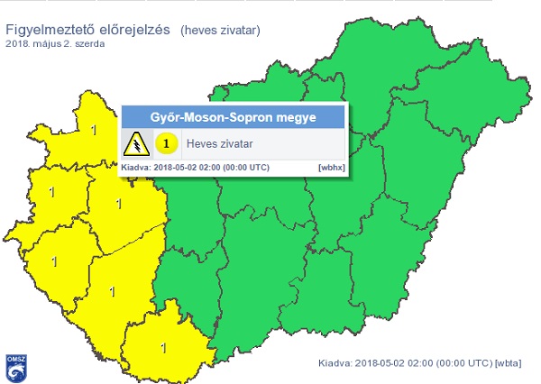 Helyenként heves zivatar is kialakulhat, melyet felhőszakadás, jégeső és viharos szél is kísérhet, emiatt megyénkre is figyelmeztetés érvényes. Zivataroktól függetlenül is élénk, erős lehet a délkeleti szél. A csapadék ellenére nem lesz lehűlés, délután 28 fokot mérhetünk.