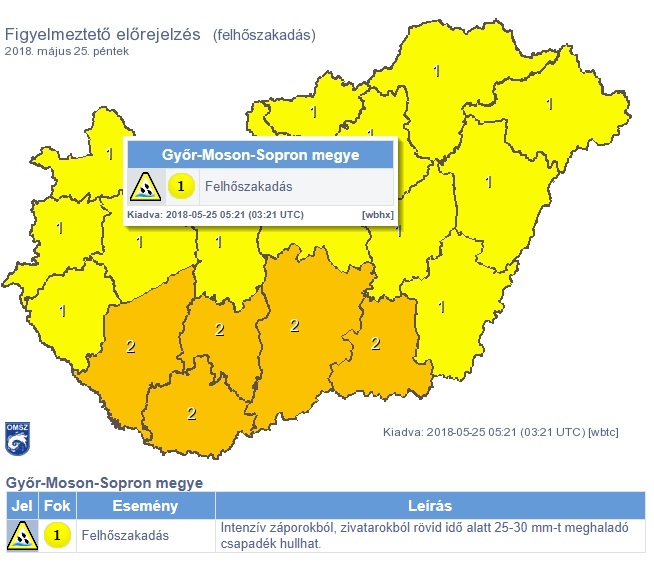 Pénteken is nagy az esély a felhőszakadásra, emiatt figyelmeztetést adott ki az Országos Meteorológiai Szolgálat.