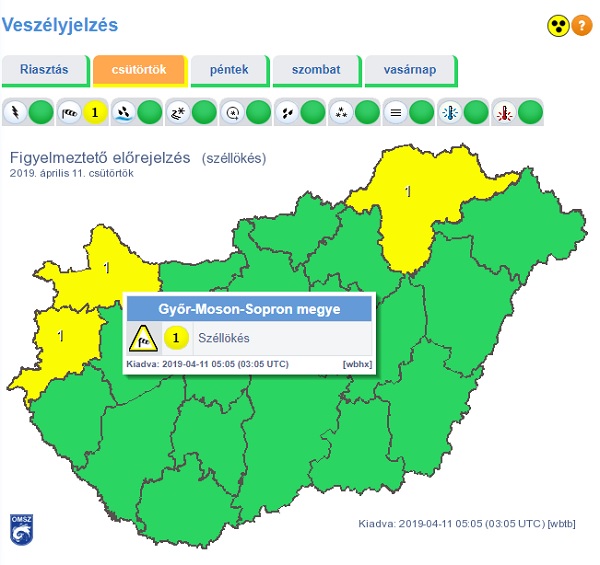 A várt legerősebb széllökések meghaladhatják a 70 km/h-t.