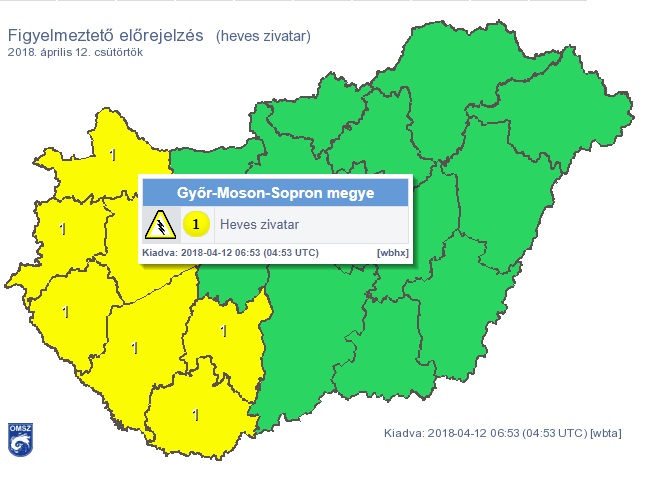 Kis valószínűséggel kialakulhat térségünkben heves zivatar (károkozó szél vagy nagy méretű jég kíséretében), emiatt figyelmeztetés érvényes.